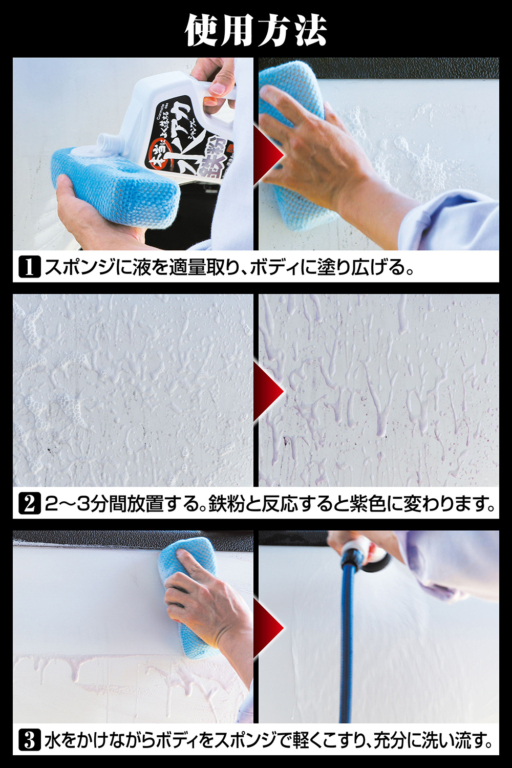 製品を塗り広げる → 化学分解(2〜3分間) → 軽〜くこする! つまりゴシゴシ不要です。