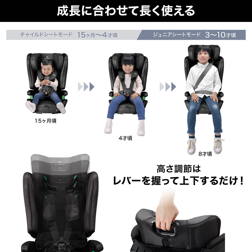 | 年齢の目安 | チャイルドシートモード: 15ヶ月を超えてから ジュニアシートモード:15ヶ月-10才頃 |