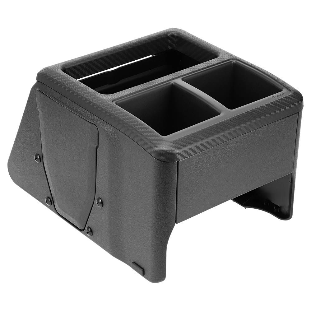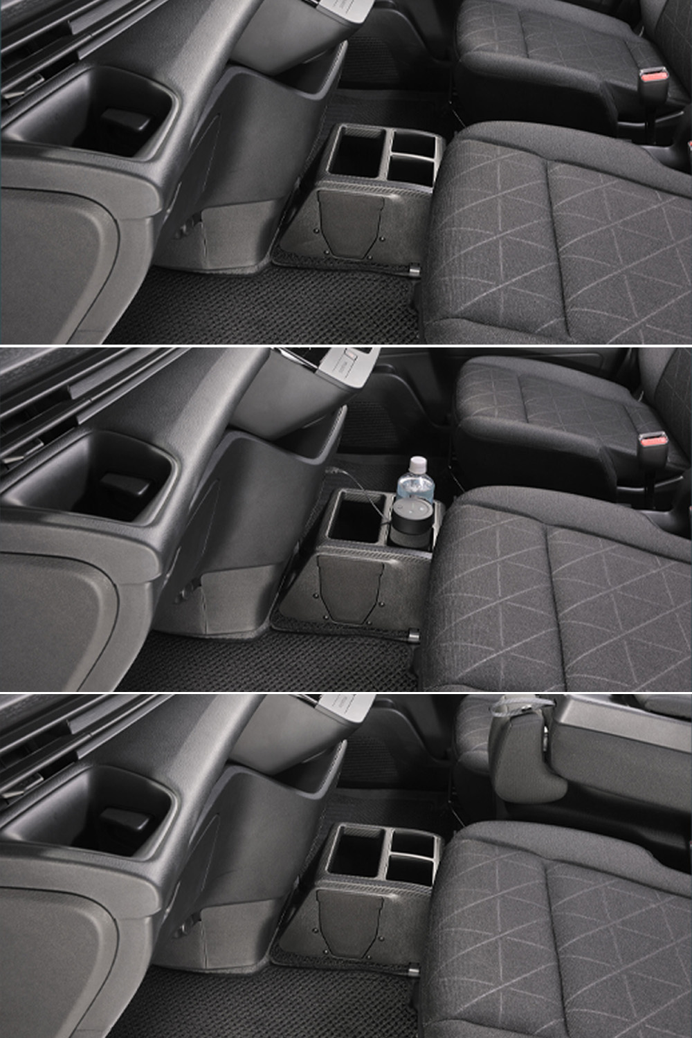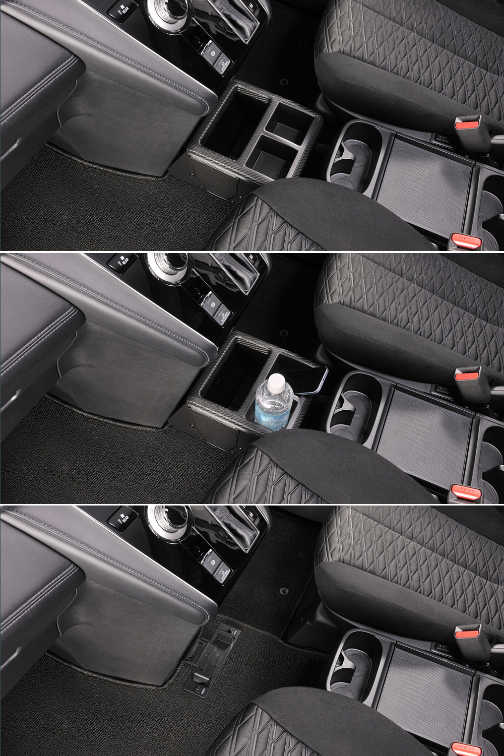 細缶から500ml紙パック飲料が入るドリンクホルダーが2か所、捨てやすい位置にあるゴミ箱を備えたデリカD:5/セレナ専用の前席中央の足元にピッタリの多機能なコンソールボックスです。