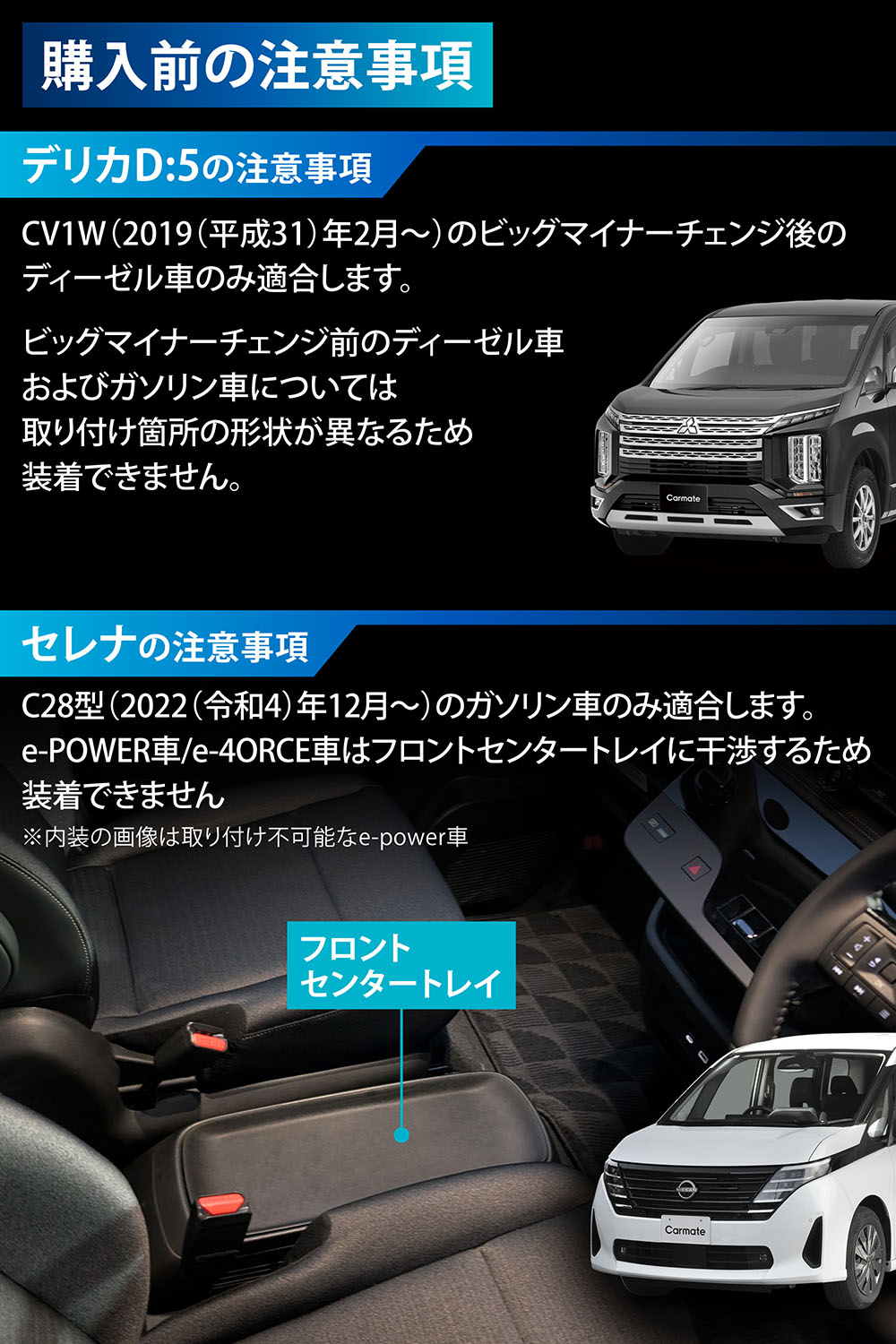 e-POWER・e-4ORCE車はフロントセンタートレイもしくはフロントセンターコンソールに干渉し装着できませんのでご注意ください。