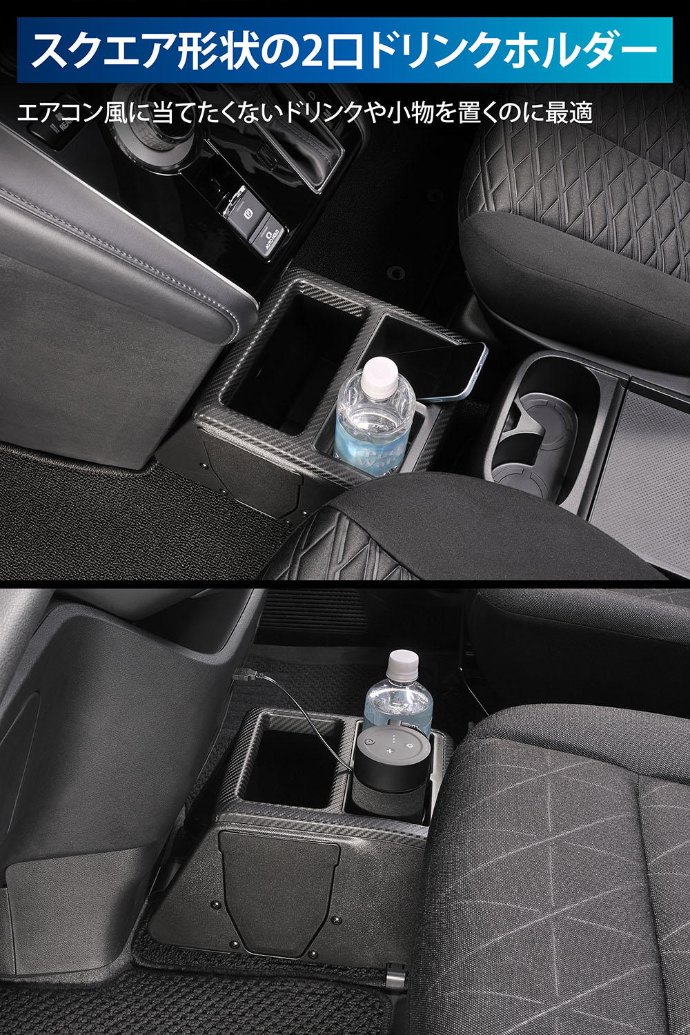 ドリンクホルダー部は直径もしくは1辺の長さが約74mmまでの容器に対応しており、500mlペットボトル・500ml紙パック等の飲み物はもちろん、噴霧式ディフューザーや車載用空気清浄機などを置くのにも適しています。