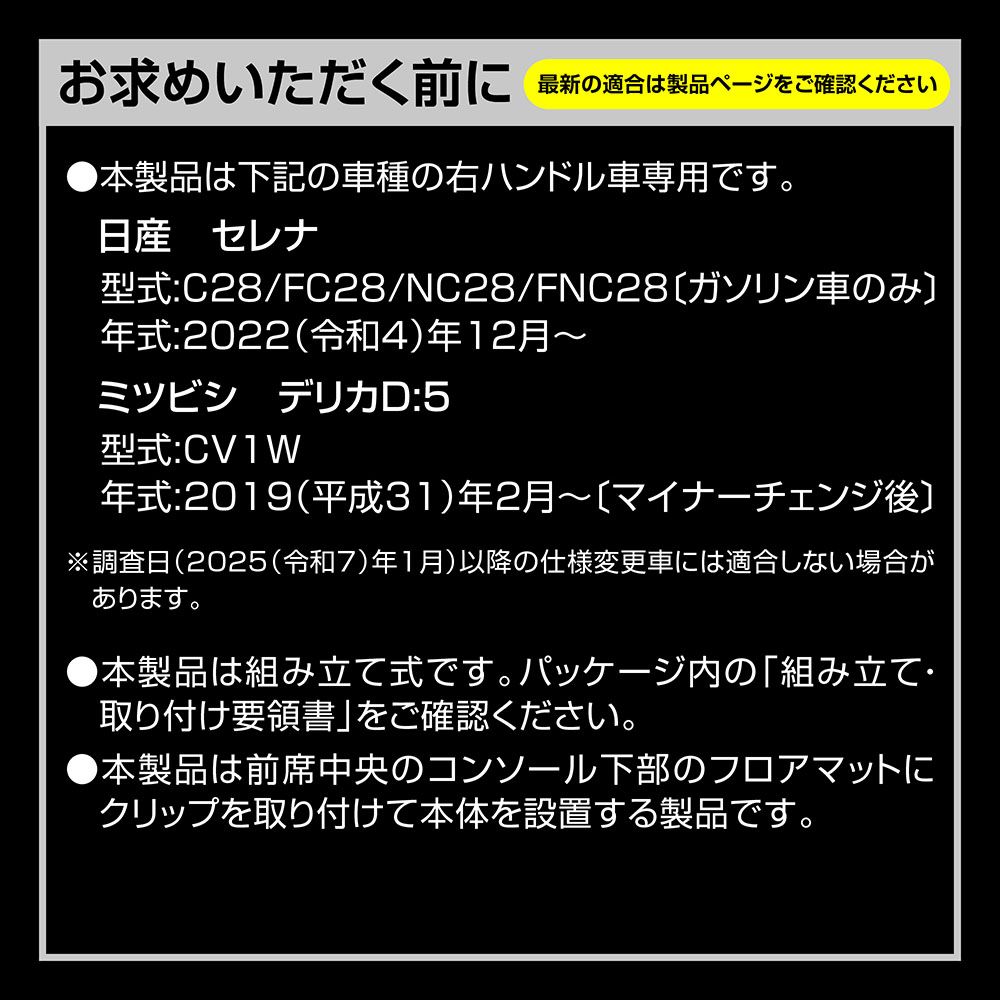 本製品はデリカD:5(CV1W)のマイナーチェンジ後のディーゼル車(2019(平成31)年2月〜)のみ適合します。