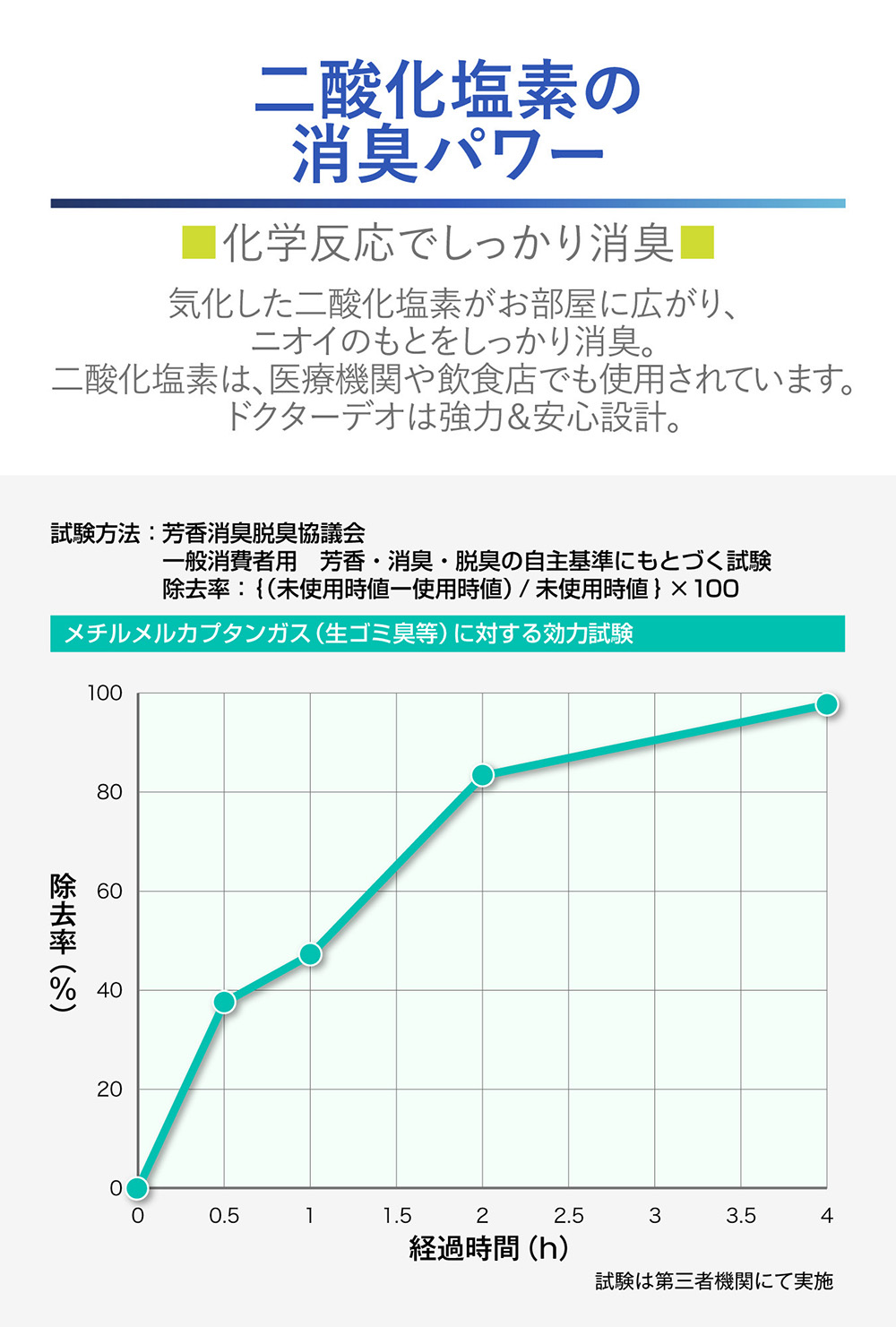 「体感できる確かな消臭性能」が支持されています。 「二酸化塩素」は医療機関や飲食店で業務用としても使われています。 ドクターデオは強力&安心設計
