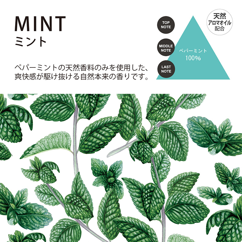 ミントの香りは、ペパーミントの天然香料のみを使用した、爽快感が駆け抜ける自然本来の香り