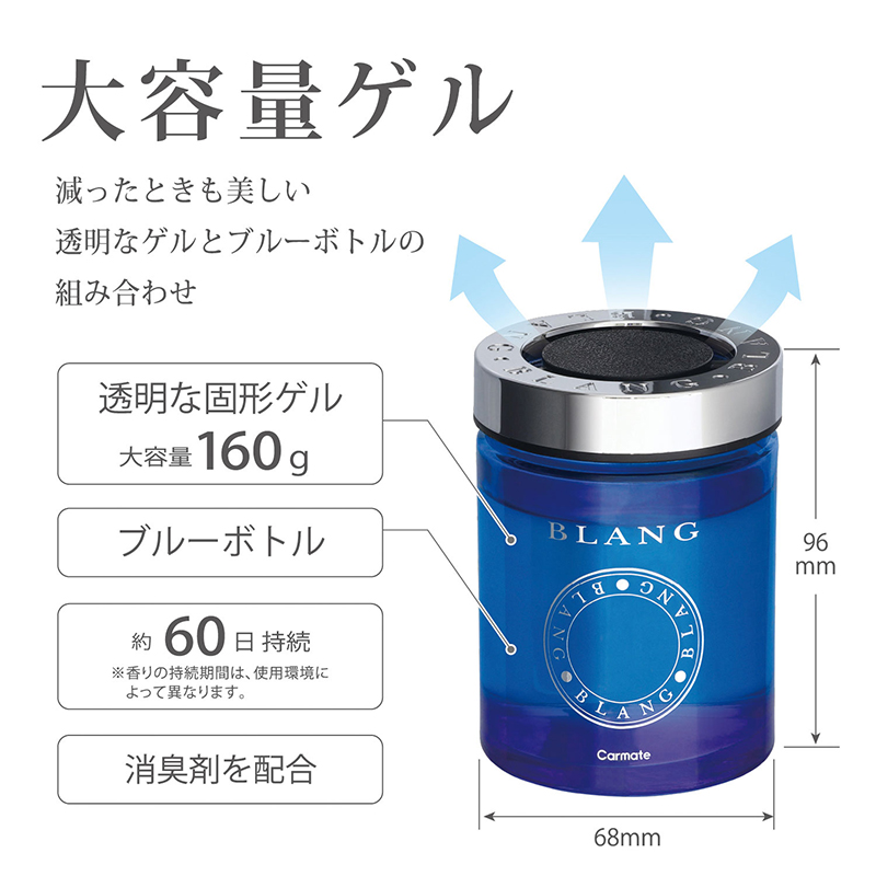 美しい透明ゲルをたっぷり160g詰めた香りが長持ちする芳香剤です。ガラスボトルにクリアブルーの塗装をしているため、ゲルが減った時も美しい色を保ちます。キャップにはクロームメッキを施し、シンプルながら高級感のある仕上がりになっています。