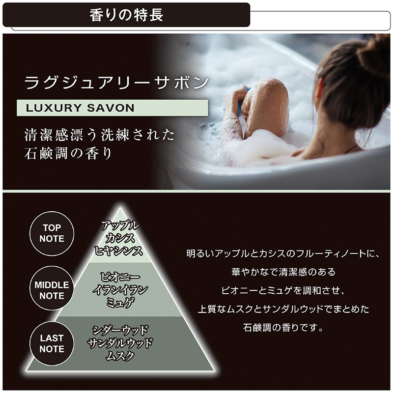 明るいアップルとカシスのフルーティノートに、華やかなで清潔感のあるピオニーとミュゲを調和させ、上質なムスクとサンダルウッドでまとめた石鹸調の香りです。