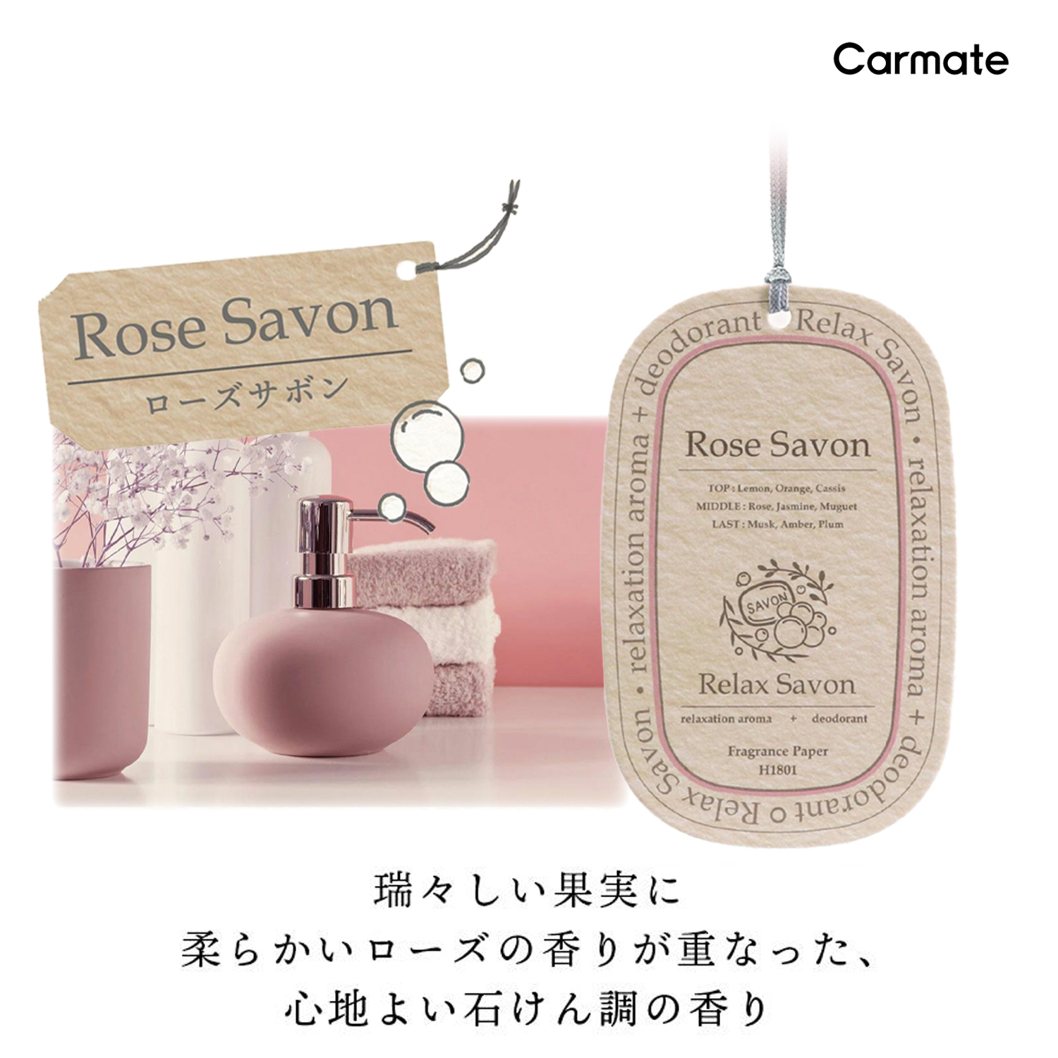 | H1801 ローズサボンの香り 瑞々しい果実に柔らかいローズの香りが重なった、心地よい石けん調の香り。 | |