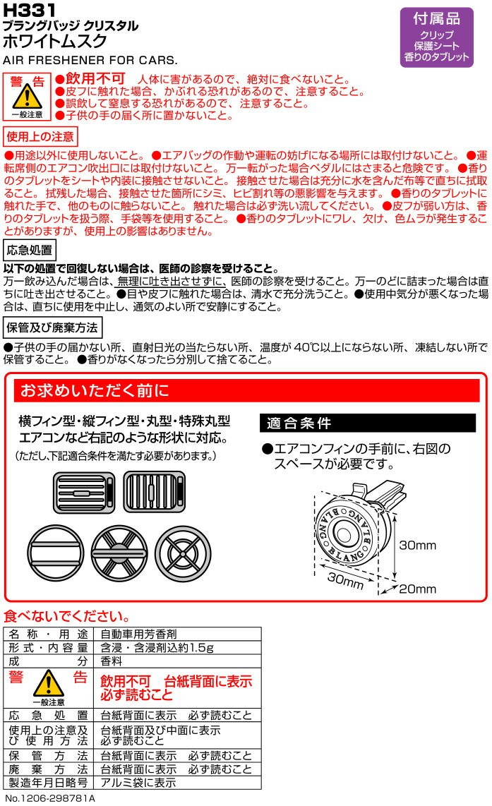 芳香剤 車 ホワイトムスク おすすめ ブラング BLANG カーメイト H331 ブラングバッジクリスタル エアコン吹き出し口取付芳香剤 carmate
