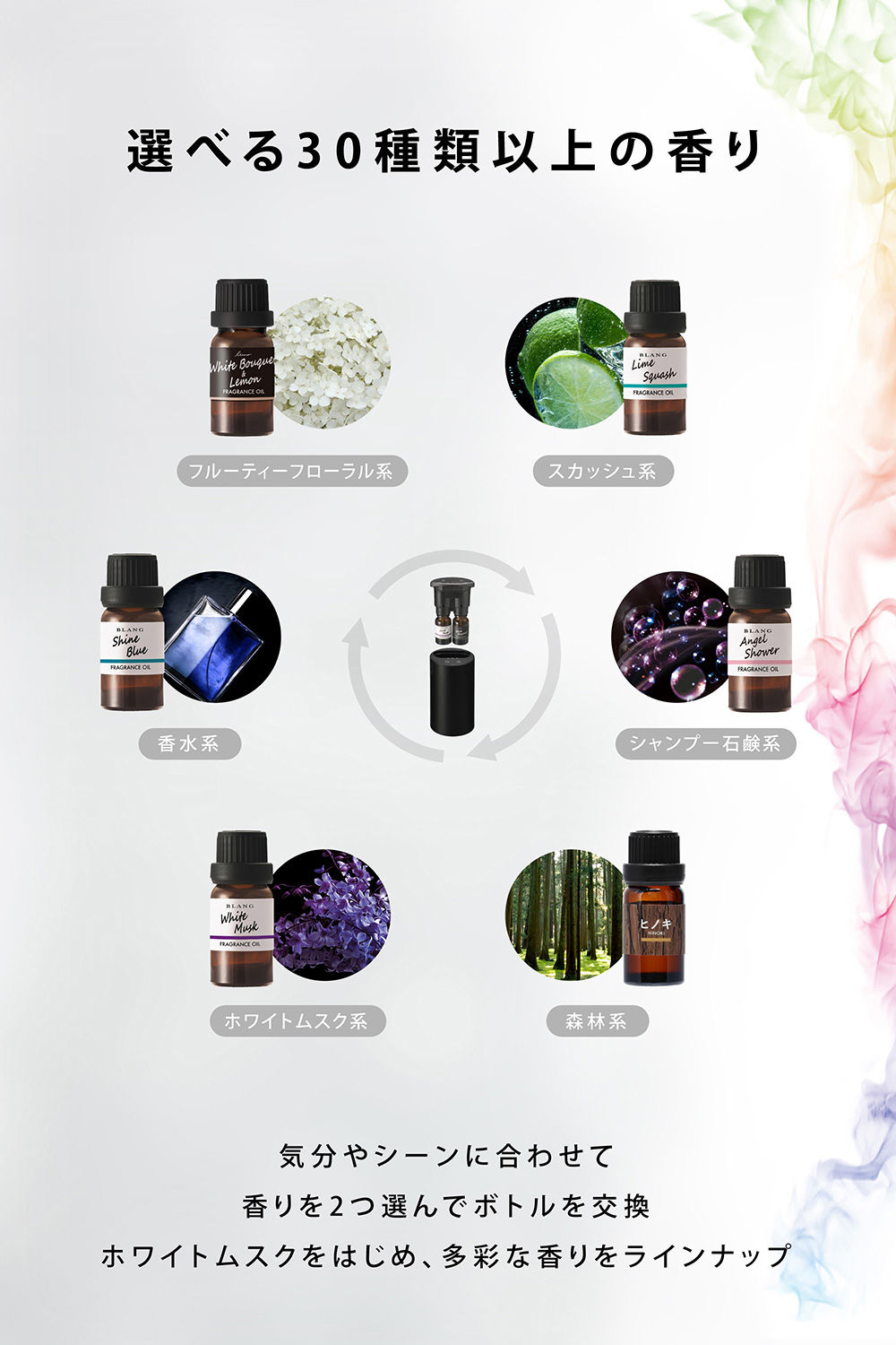 専用ボトルの香りは、ホワイトムスクをはじめ、多彩にラインナップしています。