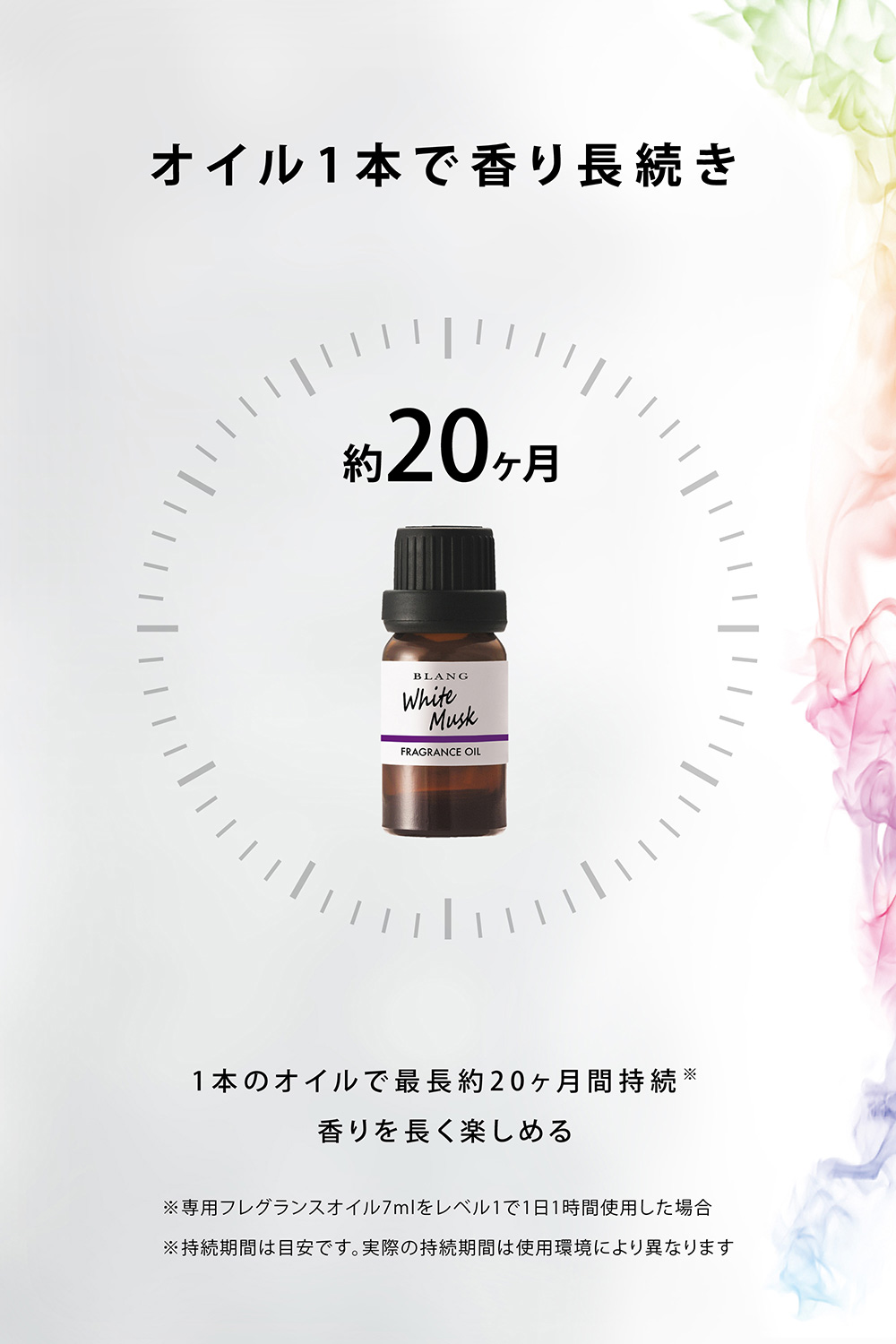 専用フレグランスオイルをレベル1で1日1時間使用した場合、最長で約20ヶ月香りが持続します。