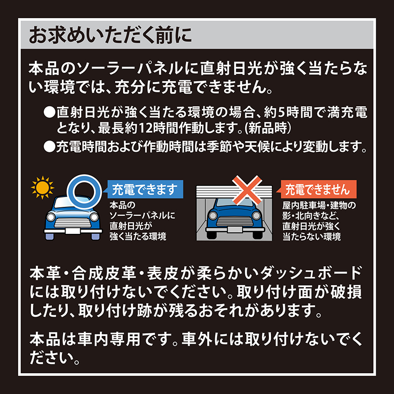 ・直射日光が強く当たる環境の場合、約5時間で満充電となり、最長約12時間作動します。(新品時)