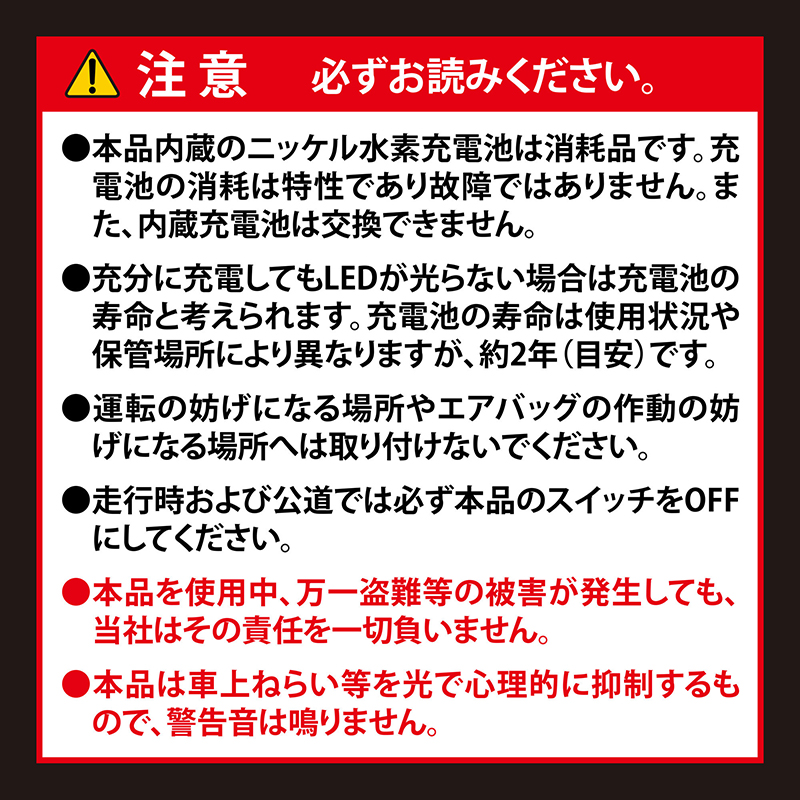 ・本品は車上ねらいなどを光で心理的に抑制するもので、警告音は鳴りません。