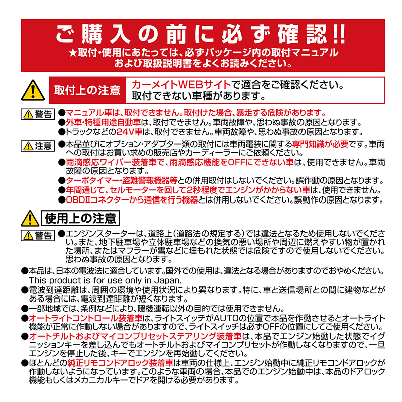 当社は、独自の調査システムで実車による装着テストを行っています。実車調査の終えたものから、装着可否情報を公開しておりますので、ご購入前に必ずご確認ください。適合品番や取付方法などよくわからないときは、「商品よりお問い合わせ」いただくか、カーメイトサービスセンターまでご連絡ください。