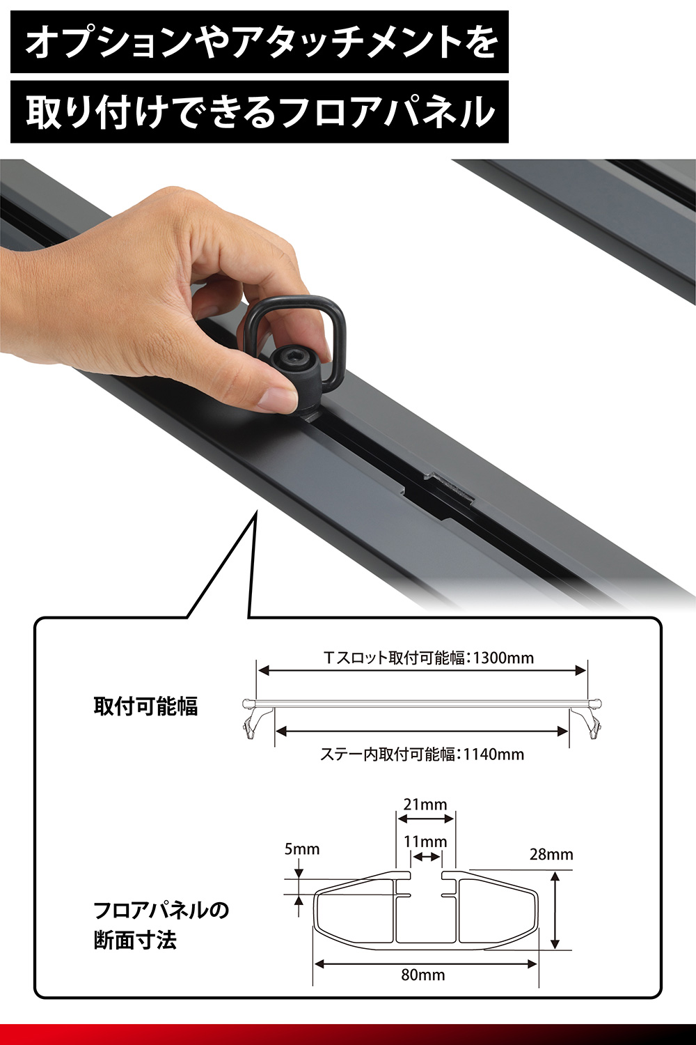 全フロアパネルにTスロットを設けることで、アタッチメントやオプションを自由自在に取り付けることができます。