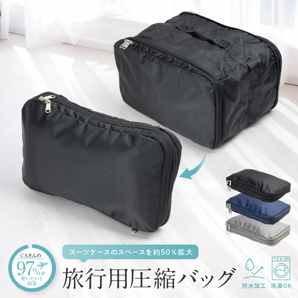 | | コペルタの旅行用圧縮袋はファスナーを閉めるだけで、かさばる荷物が一気にスリムに! トラベルポーチに衣類を入れた後、ファスナーを閉めることでスーツケース内のスペースを約50%節約することができ、スッキリ整理整頓されます。収納が苦手な方でも簡単に整理できます |