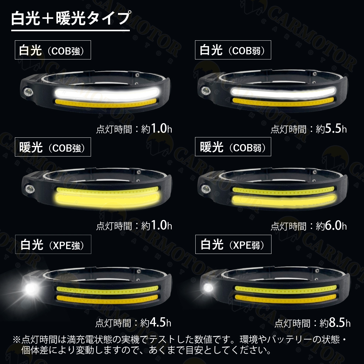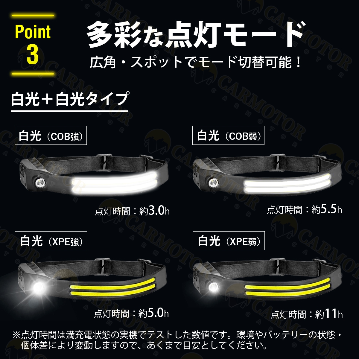 ●連続点灯時間:約2〜4時間(点灯モードやバッテリーの状態・環境により大きく変わります)