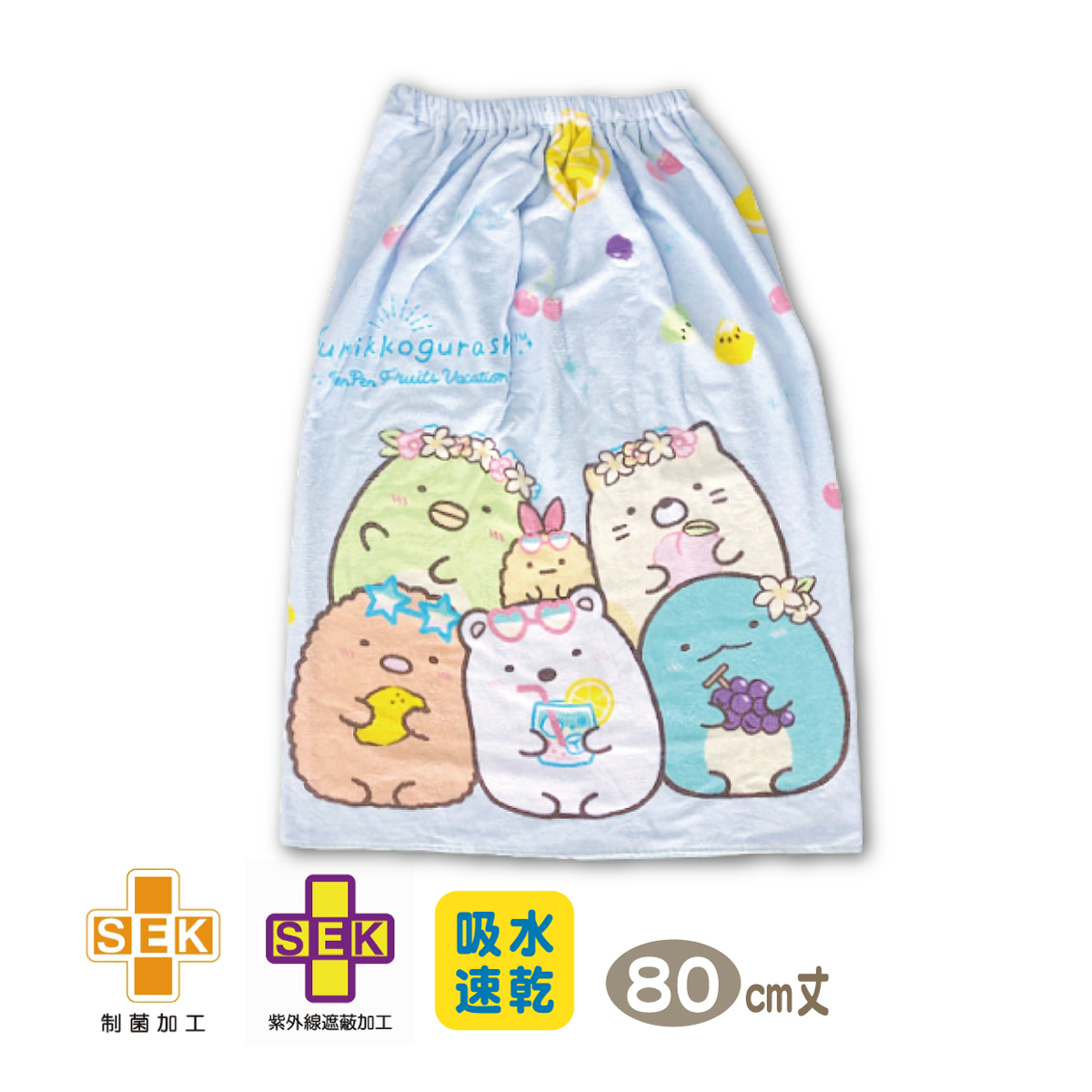 ラップタオル 巻きタオル すみっコぐらし 女の子 80センチ 送料無料 サンエックス サックス パープル ラベンダー フルーツ ゴムスナップ付き ペンギン? えびふらいのしっぽ ネコ とかげ とんかつ しろくま スイミング プール 水泳 子供 キッズ 幼稚園 小学生 キャロル