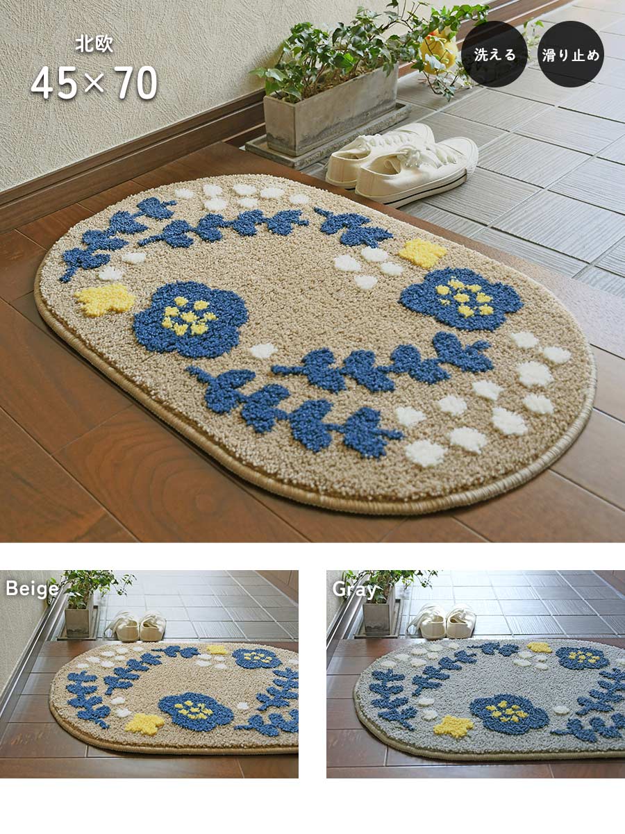 玄関 エントランス マット 玄関マット 45 70 洗える 滑り止め 北欧 ボタニカル フラワー オーバル 楕円 おしゃれ お洒落 オシャレ かわいい 可愛い インテリア ISHIBASHI イシバシカーペット カーペットイシバシ