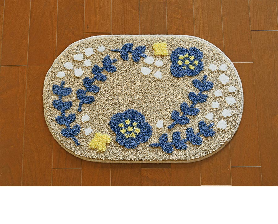 速乾性の高いポリエステルを100%使用し、柄の部分はパイル長約14ミリ、ベース部分は約10ミリのカットパイルの構成で柄行に動きをつけました。 パイルの打ち込みもよく心地よい踏み心地を楽しめる1枚です。