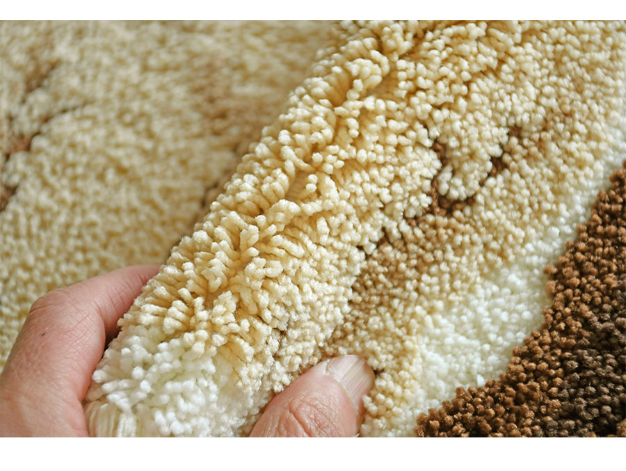速乾性の高いポリエステルを100%使用し、パイル長約15ミリ・8ミリのカットパイルで立体感のある柄行を構成しました。パイルの打ち込みもよく心地よい踏み心地を楽しめる1枚です。