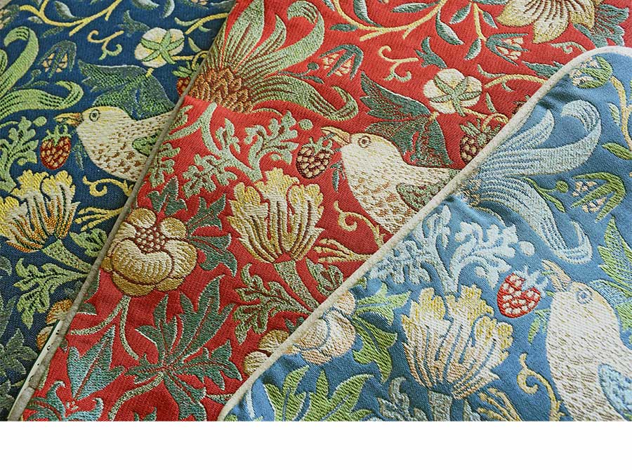 世界中で愛される、幸福な風景「いちご泥棒」を多色の糸を使って、ジャカード織で表現したファブリック。代表的なインディゴと世界的な売れ筋カラーのレッド、モダンな印象のブルーグリーンの3カラー展開。カバーはファスナー式で、取り外して洗濯が可能です。