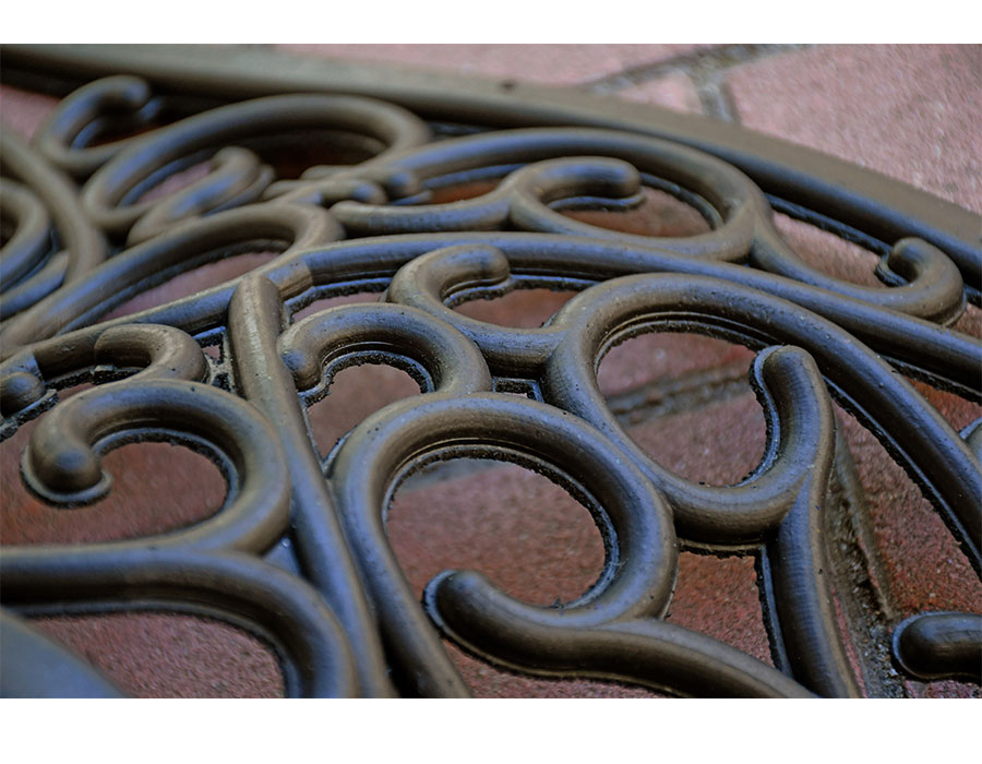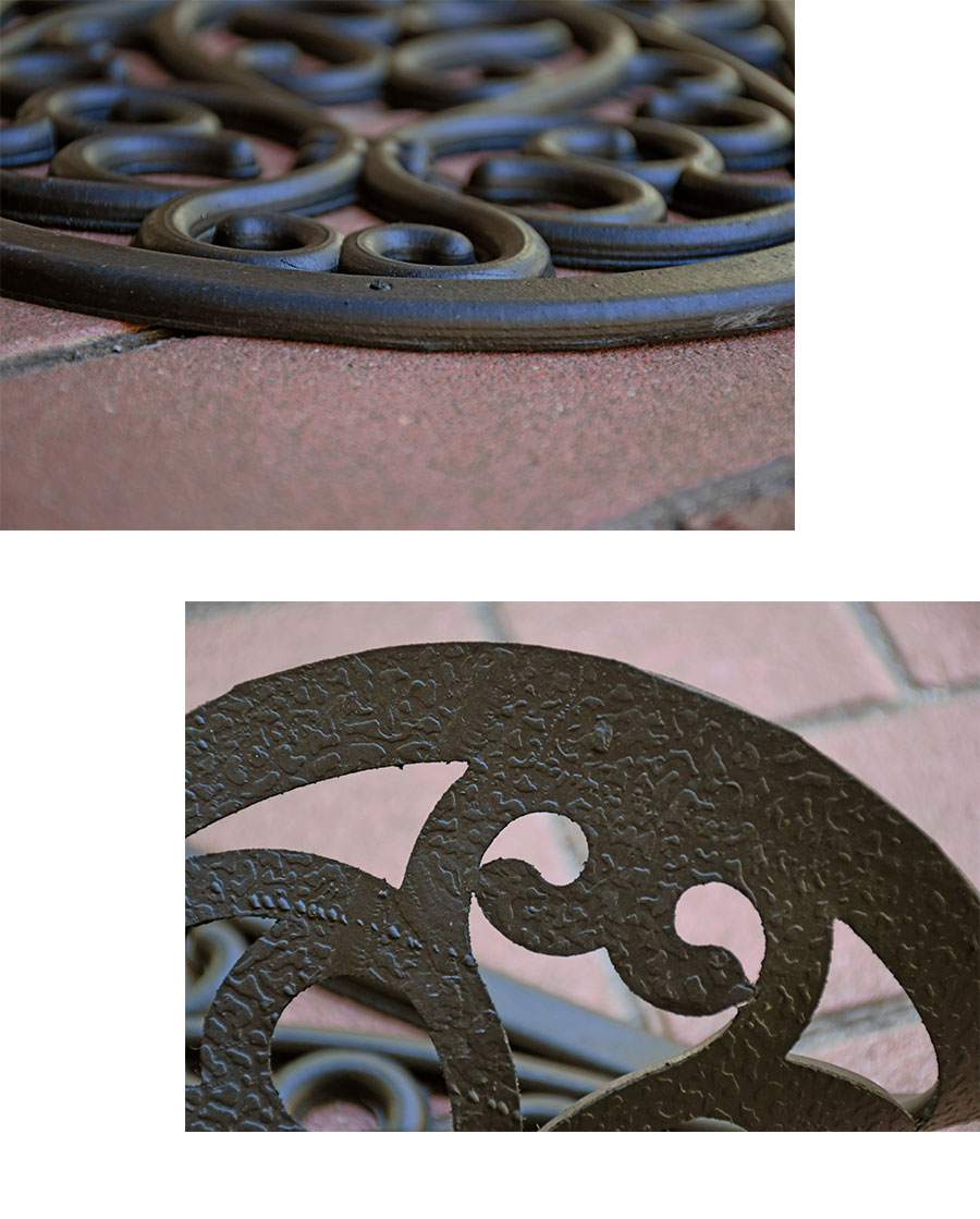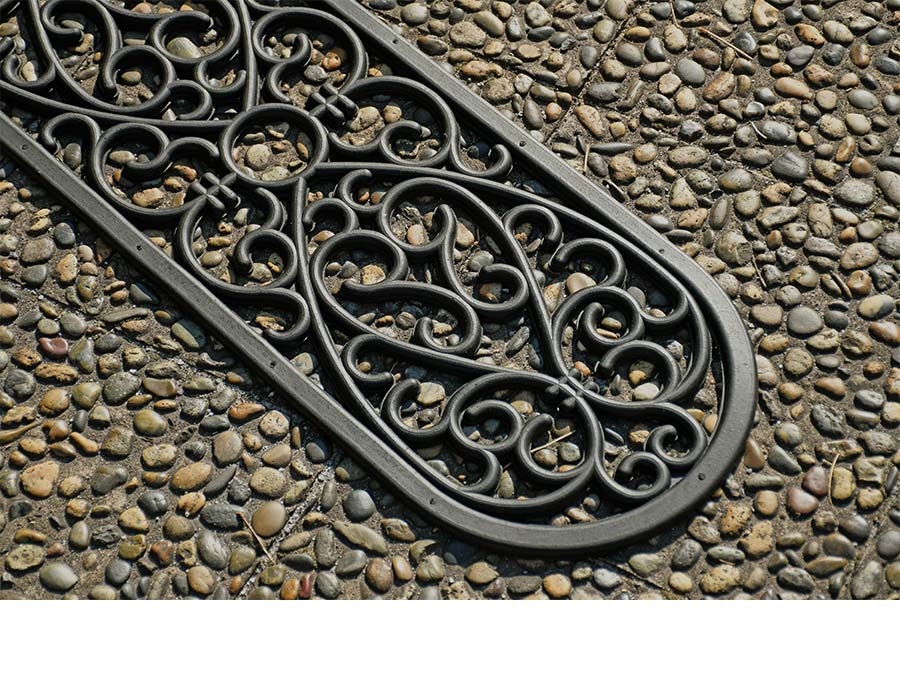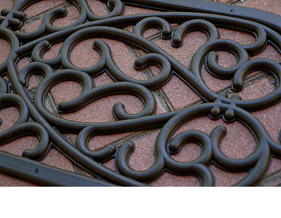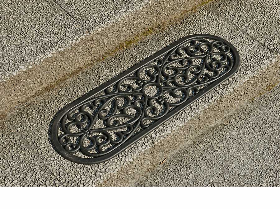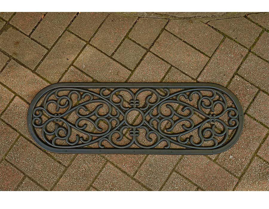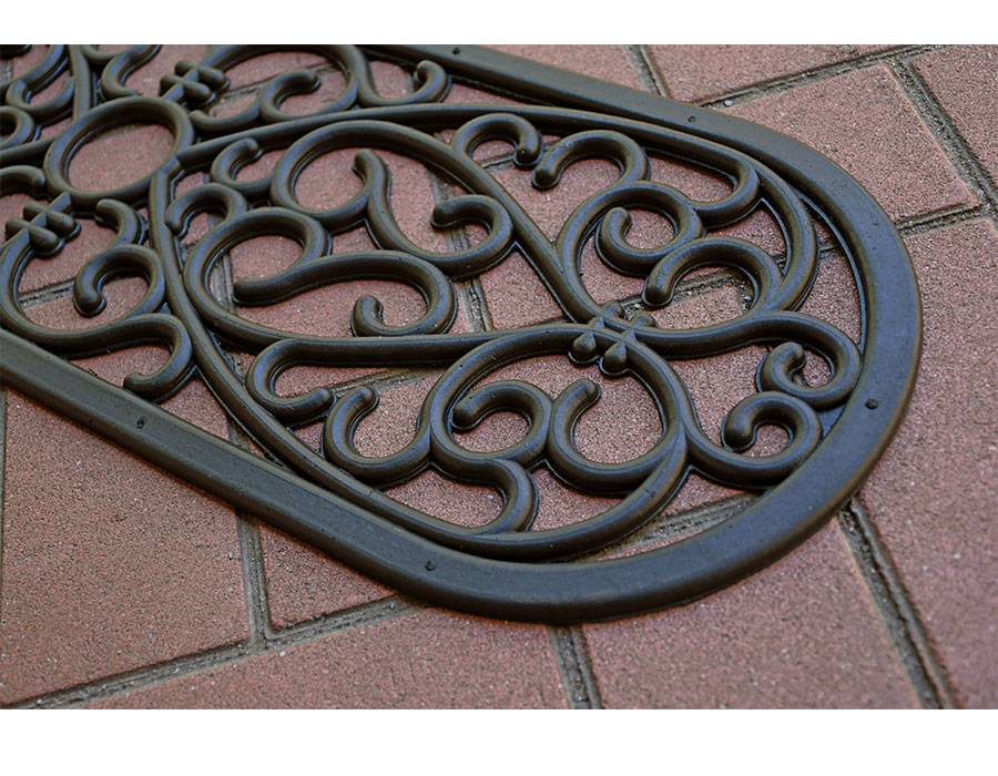 ダマスク調のモチーフが素敵なラバー素材マット。柔軟でやわらかい素材なのでタイルなどを傷つけにくく安心してお使いいただけます。玄関の階段や玄関先の段差に最適の屋外用マット。玄関のスペースが狭い方にもおすすめです。厚みは約10ミリ。重さも程よくあるので滑りにくくズレにくいです。