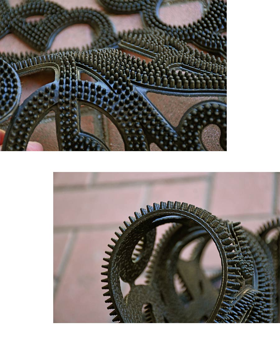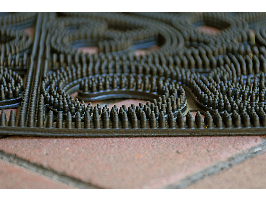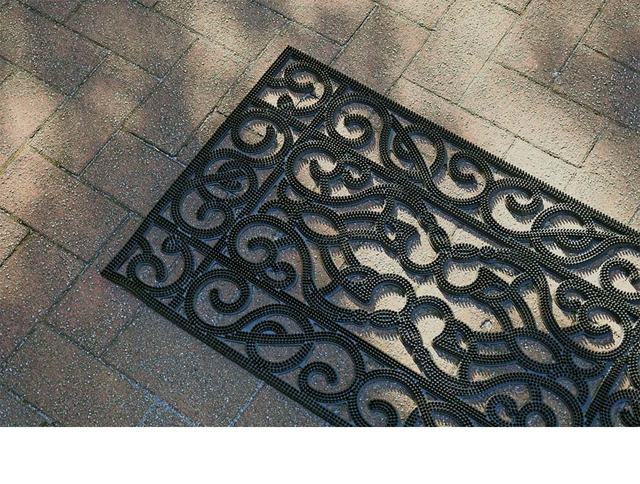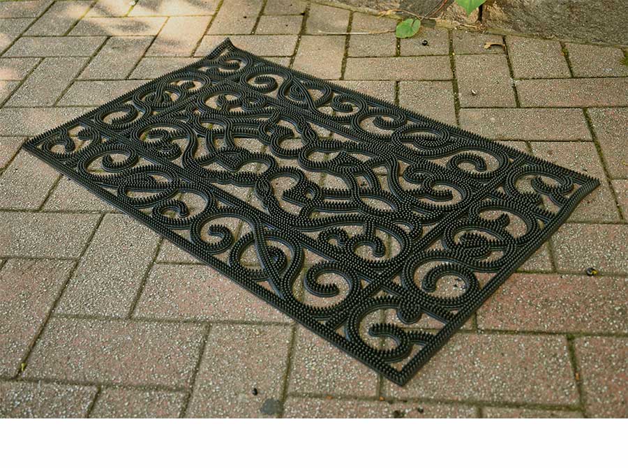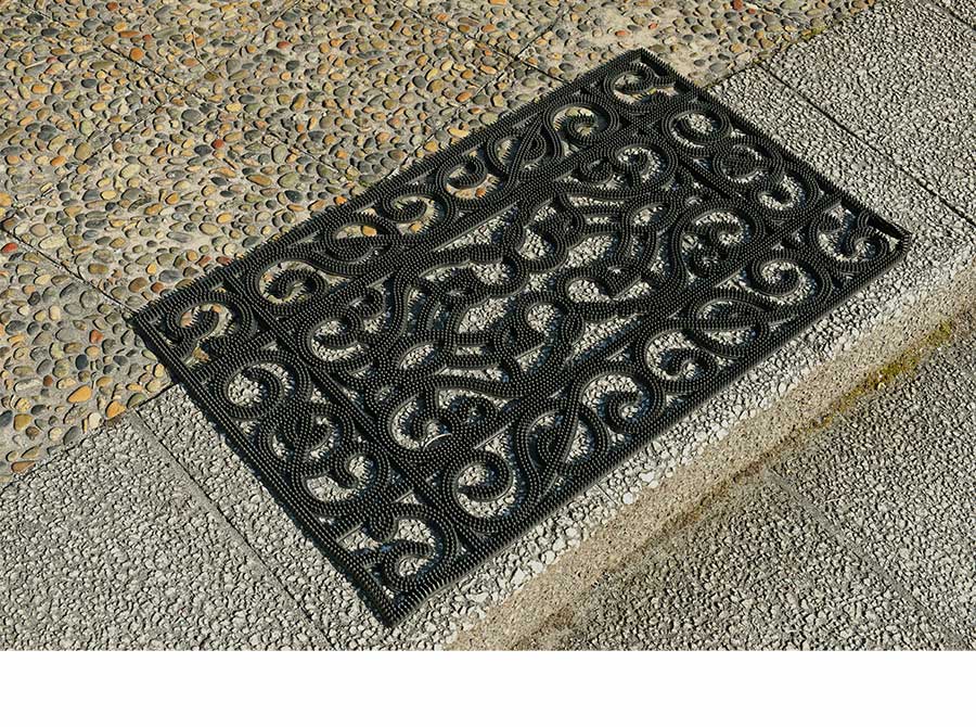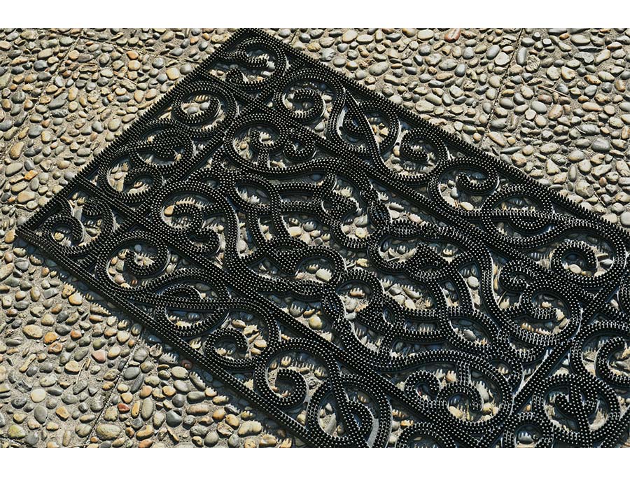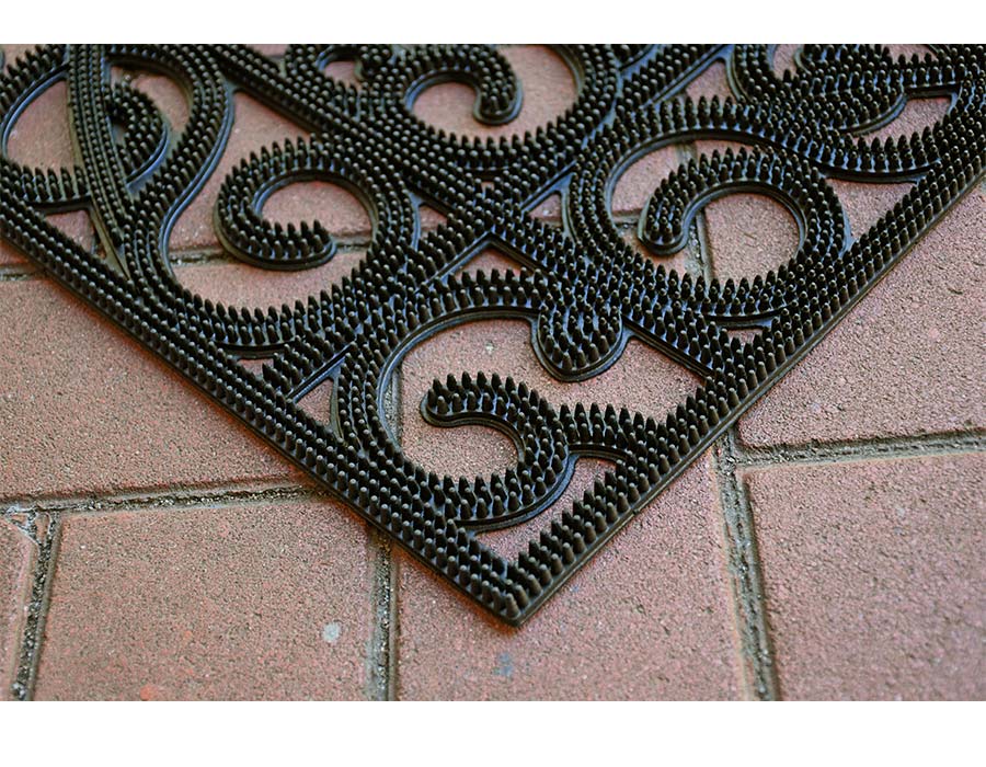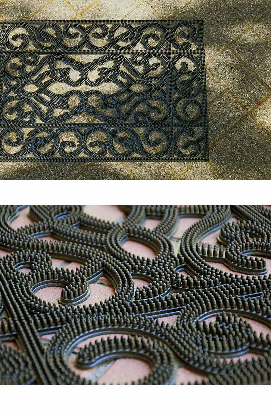 ダマスク調のモチーフが素敵なラバー素材マット。柔軟でやわらかい素材なのでタイルなどを傷つけにくく安心してお使いいただけます。靴底の泥もしっかり落とせる凹凸のあるタイプ。厚みは約12ミリ。重さも程よくあるので滑りにくくズレにくいです。