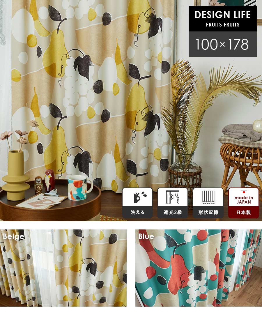 既製カーテン フルーツフルーツ 幅 100×丈 178 cm 1枚入 遮光 洗える 日本製 スミノエ デザインライフ DESIGN LIFE カーテン 送料無料