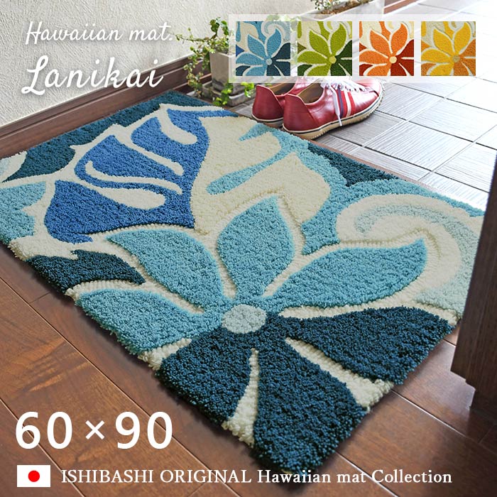 玄関マット 玄関 マット ハワイアン モンステラ プルメリア 室内 洗える 60 90 ハワイ インテリア ブルー 青 グリーン 緑 オレンジ 黄色 イエロー アイボリー おしゃれ お洒落 オシャレ 風水 プレゼント 母の日 ISHIBASHI イシバシカーペット カーペットイシバシ
