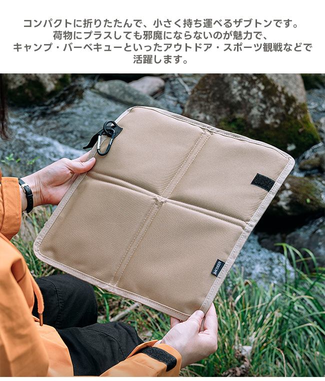 コンパクトに折りたたんで、小さく持ち運べるザブトンです。荷物にプラスしても邪魔にならないのが魅力で、キャンプ・バーベキューといったアウトドア・スポーツ観戦などで活躍します。