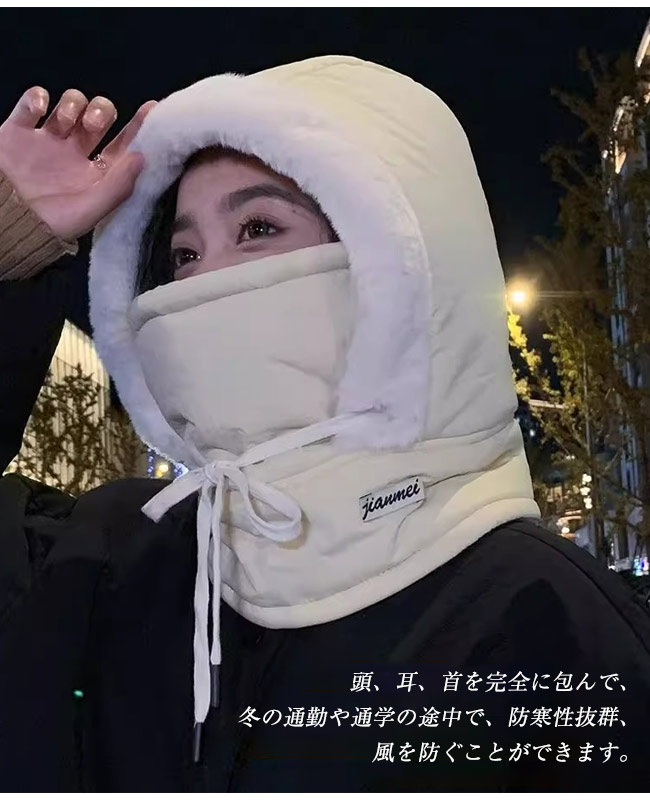 頭、耳、首を完全に包んで、冬の通勤や通学の途中で、防寒性抜群、風を防ぐことができます。