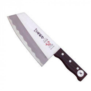 錆びにくく切れ味を確保したステンレス刃部です。滑りを押さえるためにローズを使用した柄となっています。ご家庭でも使用しやすいサイズで製作しました。剣先が尖っているタイプで、抵抗なく普通の包丁の延長感覚で使用できる刃部形状です。白菜や焼き豚などの大型食材などのカットに威力を発揮します。中華包丁の入門用としていかがですか?