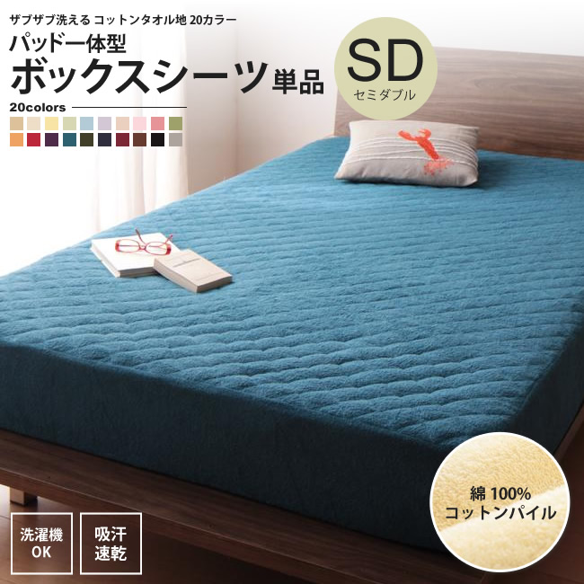 パッド一体型ボックスシーツ セミダブル 単品 : タオル地 コットン パイル 洗える マットレスカバ