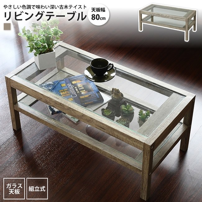 センターテーブル 幅80 おしゃれ 古材 ガラス天板 シャビ―シック 机 つくえ 北欧 ナチュラル リビング ロー コーヒー