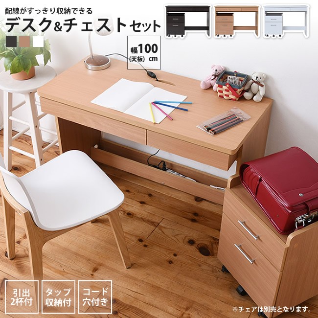 シンプルなデスクにチェストが付いたセットアイテム。デスクの足元には配線が収納できるスペースがあり、パソコンなどの充電コードが邪魔になりません。幅100cm、奥行45cmのコンパクトなデザインは、書斎でもリビングでも置き場所に困らずご使用いただけます。