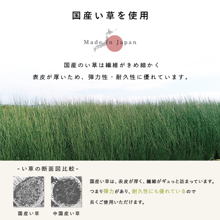 「国産い草」ならではのクッション性と踏み心地、耐久性にも優れているので長くご使用いただけます。