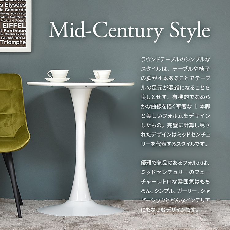 シンプルで洗練されたデザインで、スタイリッシュな空間を演出。一本脚の曲線が美しいフォルムとシンプルなホワイトが、カフェ風からモダンなど様々なスタイルに合う、流行りの韓国インテリア風なテーブル。合わせる椅子によって魅せ方を変えるのでこれ一つでお部屋の雰囲気が簡単に変えられます。