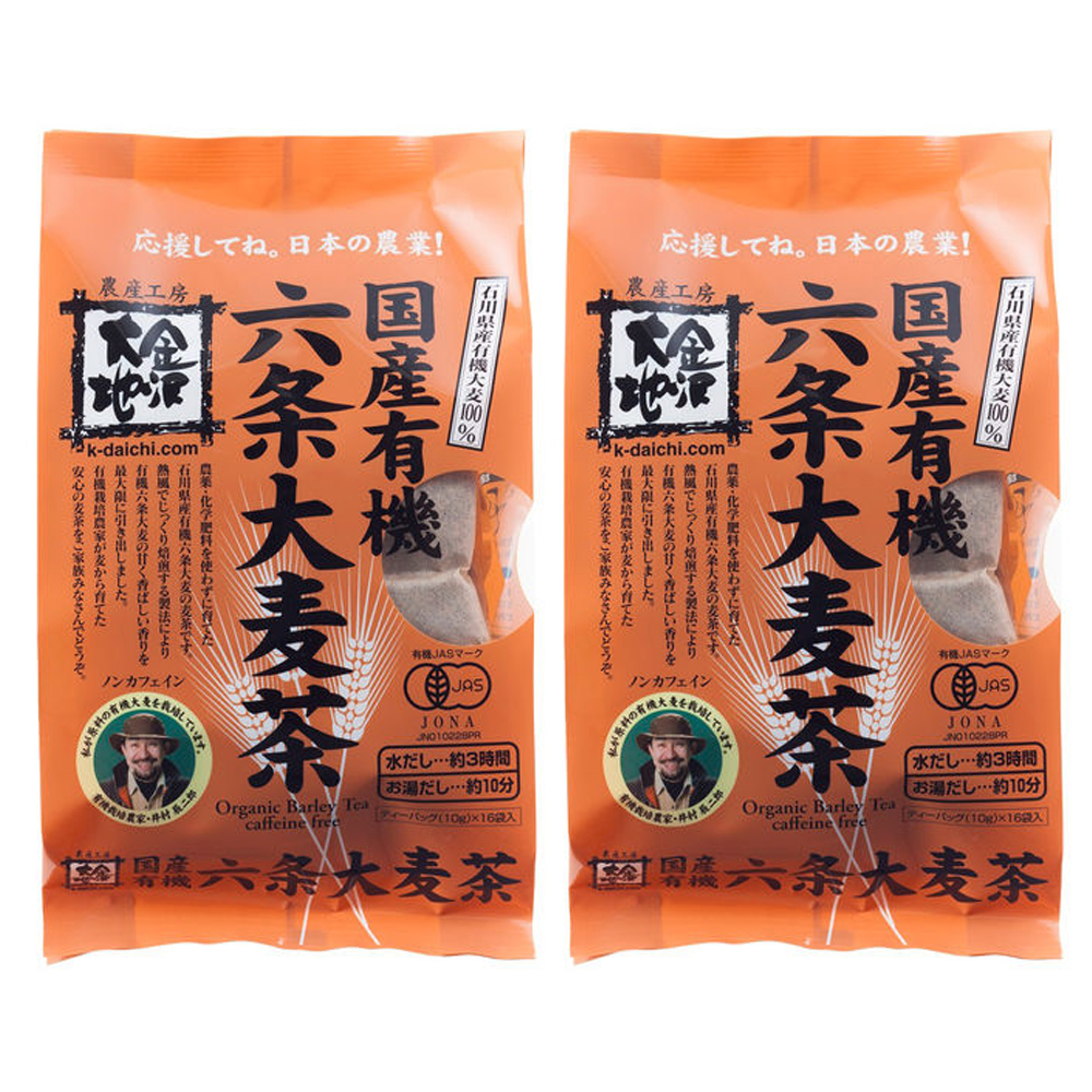 国産有機 六条大麦茶160g(10g*16袋入) 2袋セット【 石川県産 有機大麦 100%使用】水出しOK! 有機栽培 国産 オーガニック ノンカフェイン 六条大麦 甘い香り