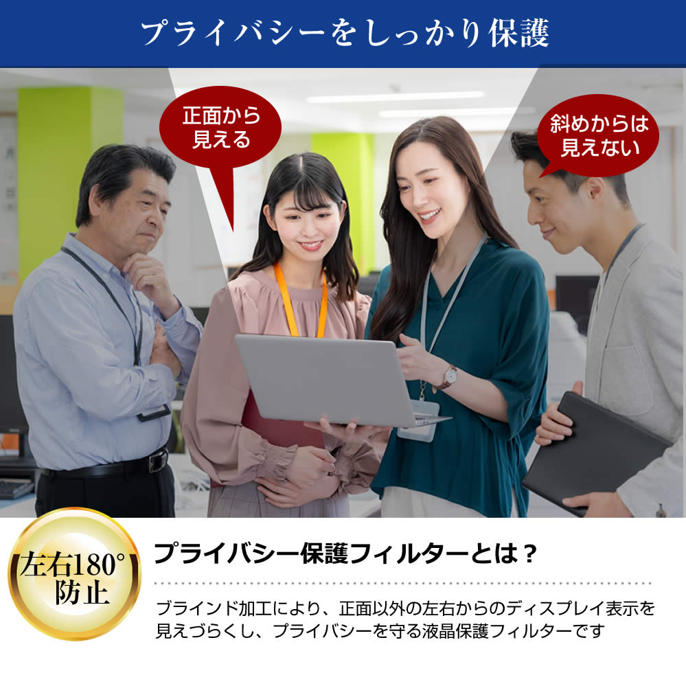 | 覗き見防止性能 | ・正面を中心に約60度(左右約30度)より外側の角度からは画面が黒く見える設計。 ・左右からの視線を遮断し、画面上の情報を第三者に見られるリスクを軽減します。 |