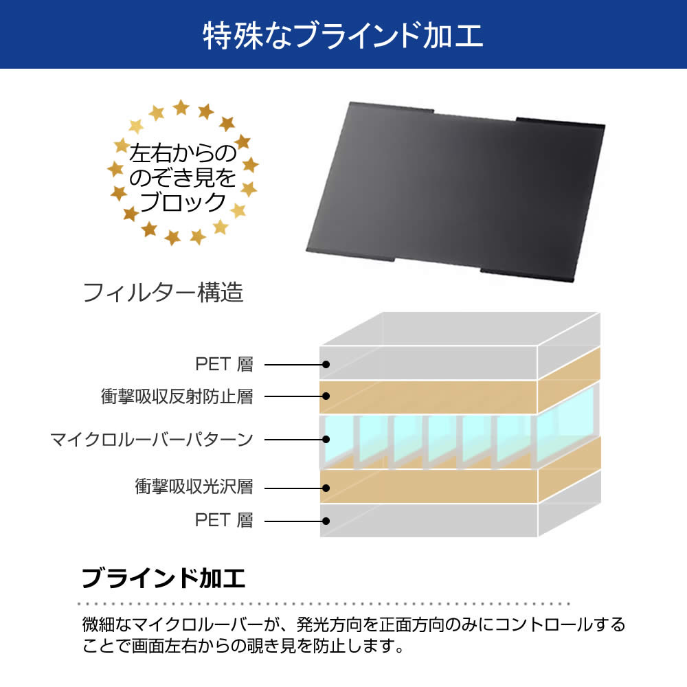 左右からの覗き見を防止しながら、反射防止加工とブルーライトカット機能で画面の見やすさと目への配慮を両立した吸着式プライバシーフィルターです。