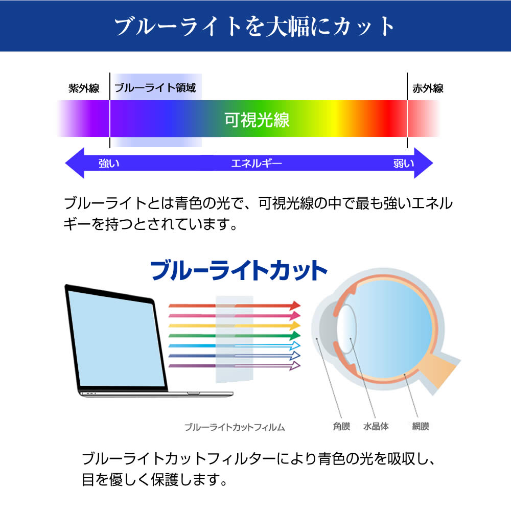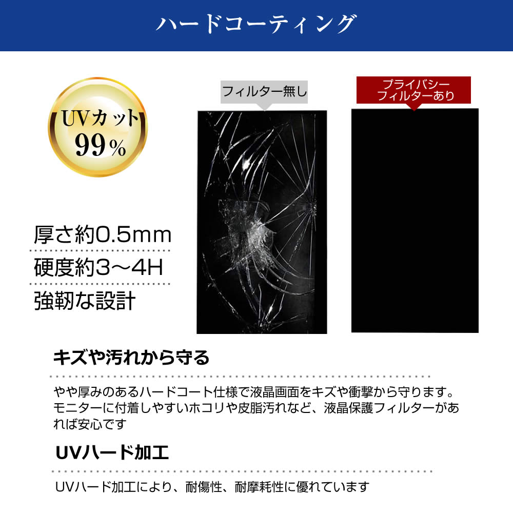 | 表面加工 | ・反射防止加工により、蛍光灯など周囲光の映り込みを軽減。 ・UVハード加工により、耐傷性・耐摩耗性に配慮しています。 |