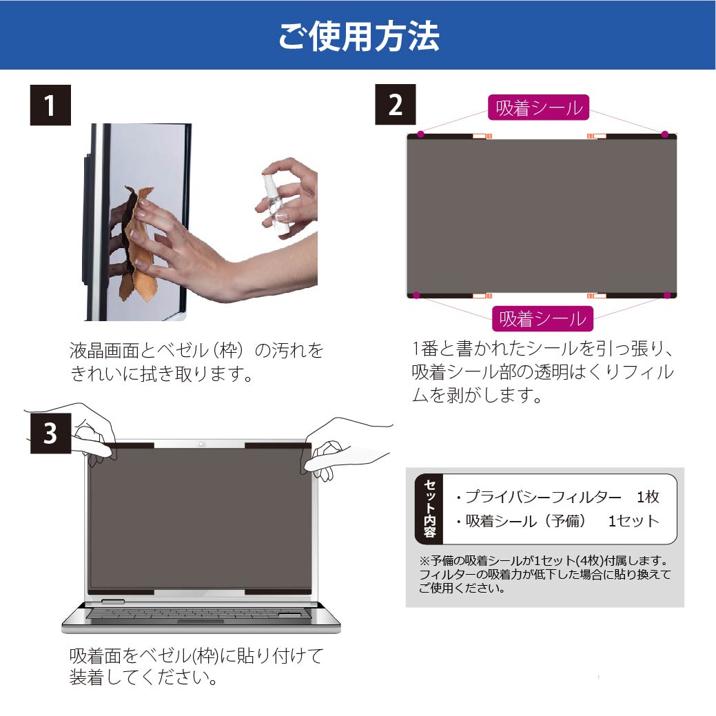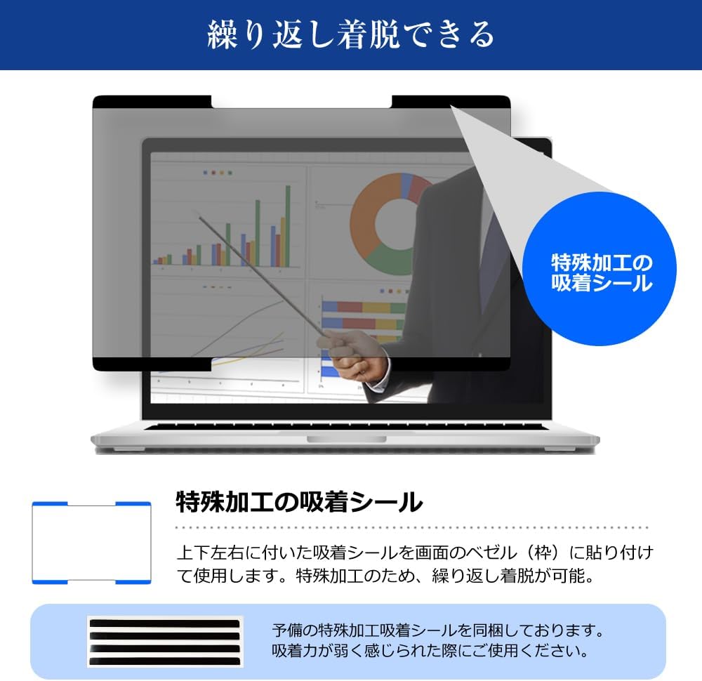 | プライバシーフィルター特徴 | ・フィルター上下に配置された吸着シールで固定する吸着式タイプ。 ・吸着シールのはくりフィルムをはがし、ノートパソコンのベゼル(枠)上下部分に数秒間押し当てることで密着します。 ・金属・磁石・粘着剤不使用のため、端末を傷つけにくく、吸着面をきれいに保てば繰り返し貼り直しが可能です。 ・吸着力が弱く感じられた場合は、交換用吸着シールをご使用いただけます。 |