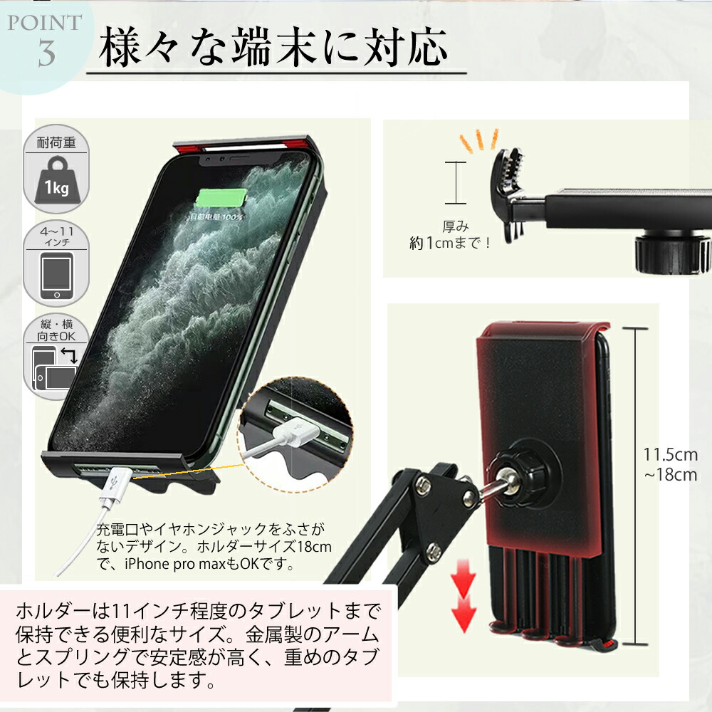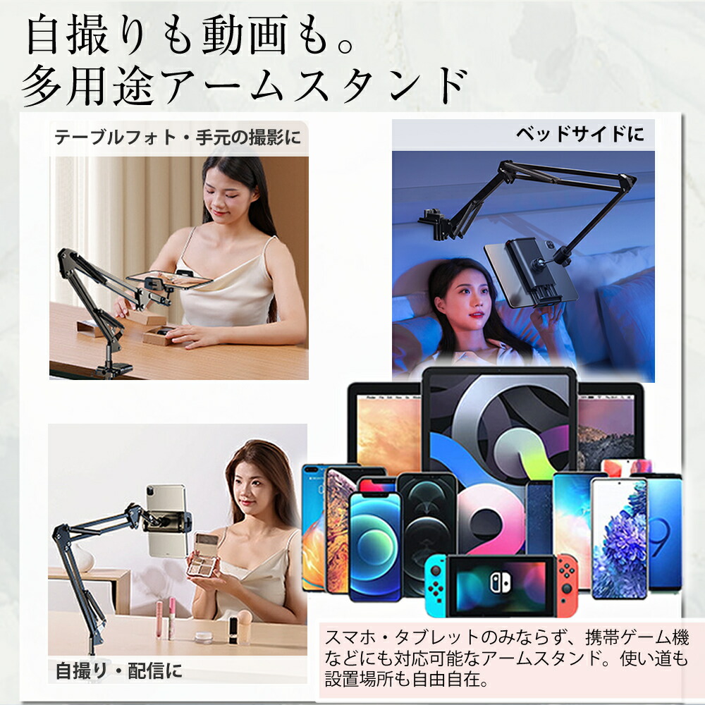 【自由な角度調整】高さ調節や360度回転可能なアームで、寝ながらの動画視聴やゲームプレイ、料理中にレシピを確認するなど、あらゆるシーンで活躍します。