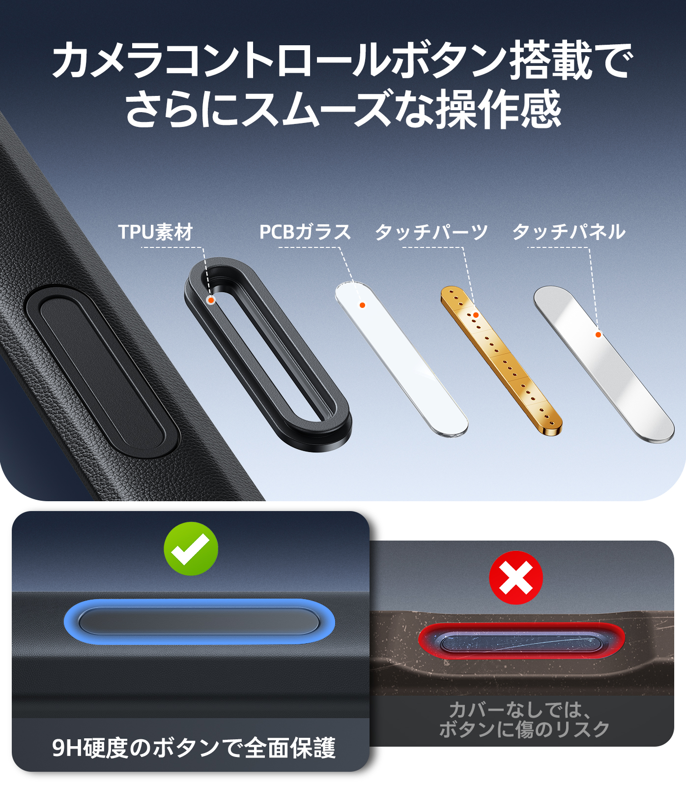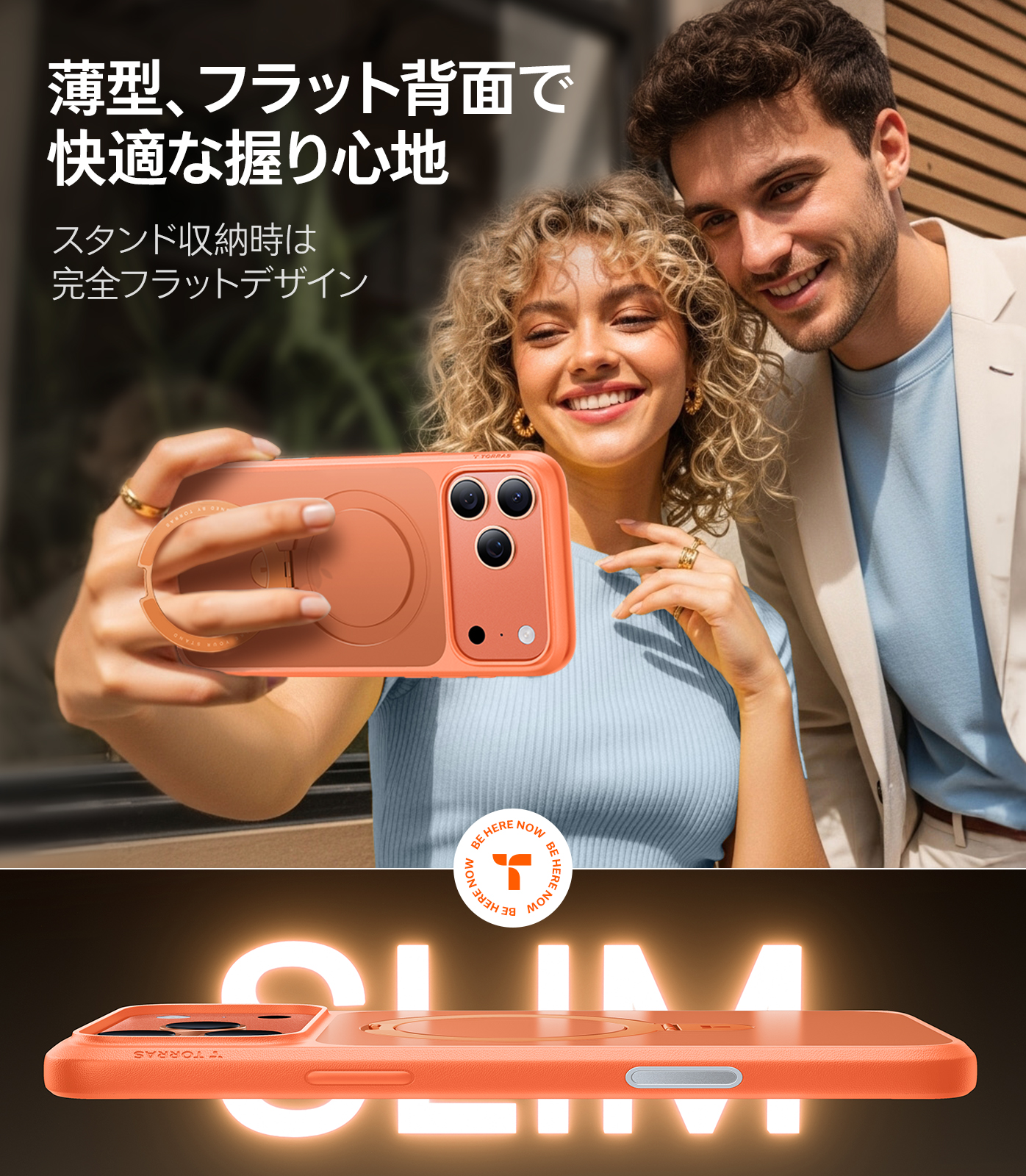 | ポイント | ・TORRAS特許取得済みデザイン/外観 ・最大180°まで開閉可能なスタンドで、画期的な使いやすさを実現!(30,000回以上の 開閉テストプレー済み) ・TORRAS独自の磁石技術:内蔵された38個のN52磁石によりMagsafeアクセ サリーに対応。 ・シームレスな一体型デザイン:デボス加工と丸みのあるフレーム形状が手にしっかり馴染みます。 ・2.44m落下防止性能:フレーム部分の強化保護デザインで2倍のMIL耐衝撃性能 ・Clear色:高透明&黄ばみに強いコーティングを採用 ・Black色,Midnight Blue色,Orange色: 防汚性に優れたマット素材を採用、サラサラとした心地よい手触り |