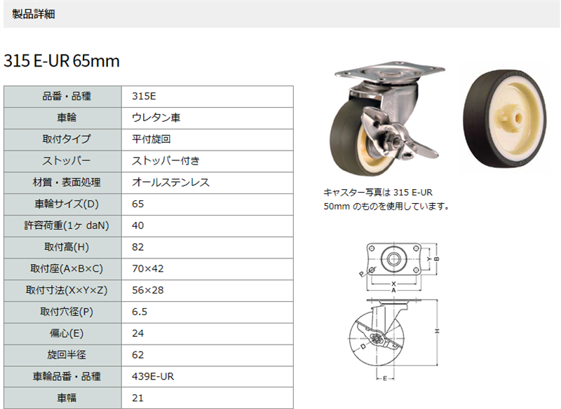 315E-UR65 ハンマーキャスター 自在ストッパー付