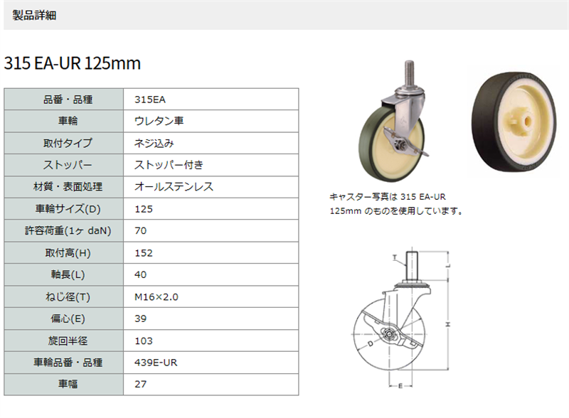 ハンマーキャスター 315EA-UR125 自在ストッパー付