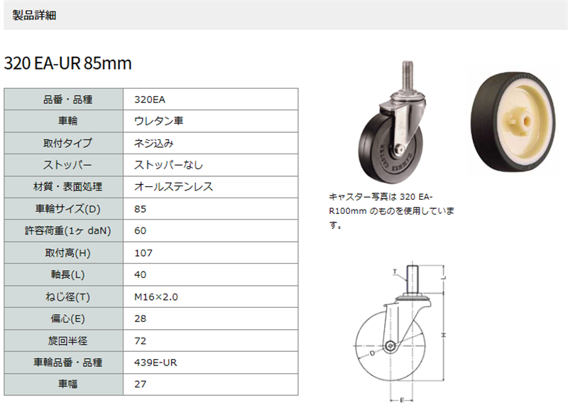 ハンマーキャスター 320EA-UR85 自在ストッパーなし