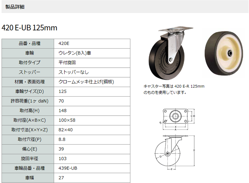 420E-UB125 ハンマーキャスター 自在ストッパーなし