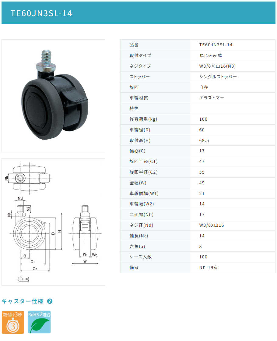 東海キャスター TE60JN3SL-14 双輪キャスター
