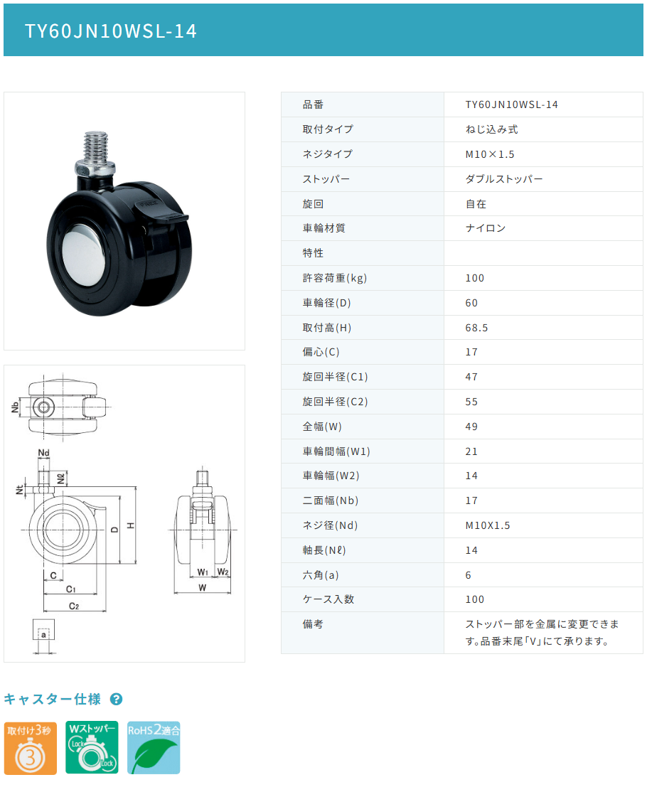 東海キャスター TY60JN10WSL-14 双輪キャスター